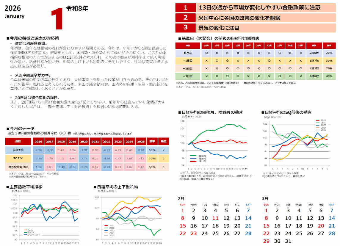 今月の傾向からみた投資戦略、主要指数の過去からの推移グラフ、日経平均のSQ前後の動きなど、市場の見方とデータから対策ができます。
