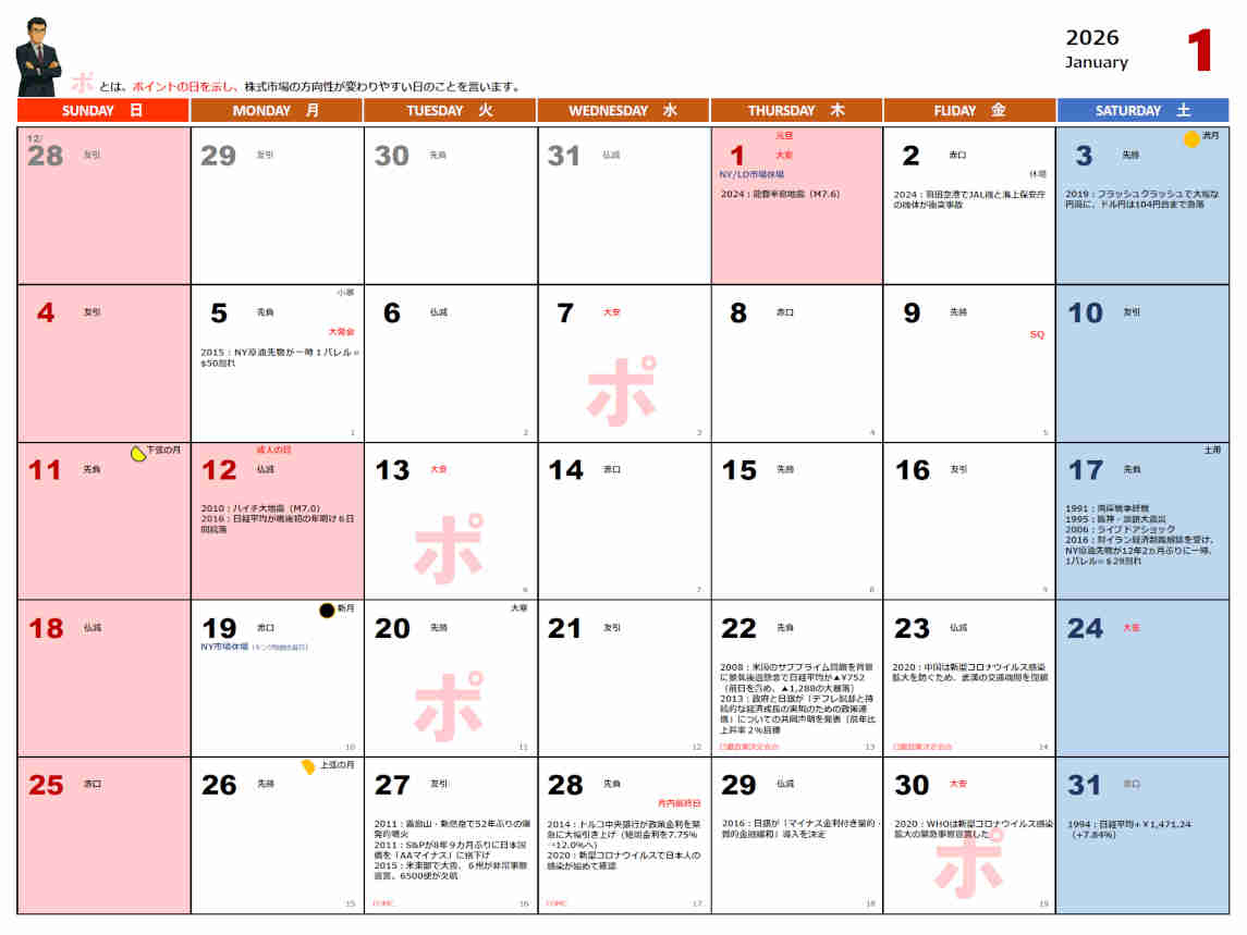 源太独自のポイントの日はもちろん、主要な政治・経済スケジュール、月の満ち欠け、八専などの株にまつわる情報をまとめています。