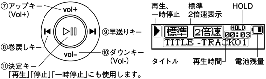 再生中に「(11)決定キー」を押すと、一時停止、さらにもう一度押すと再度再生します。 | |||||||||
